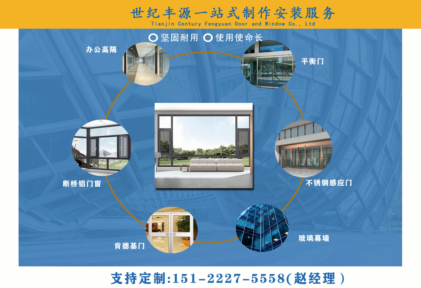 天津世紀豐源門窗有限公司從事斷橋鋁門窗,玻璃幕墻,平衡門,肯德基門,不銹鋼感應門,百葉窗,辦公高隔,制作安裝一站式訂制生產及配套服務等。 公司自成立以來,始終堅持以人才為本、誠信立業的經營原則,薈萃業界精英,成熟的技術、管理方法及企業經驗與國內企業的具體實際相結合,為企業供給各個方面的解決方案,使企業在激烈的市場競爭中始終堅持競爭力,實現企業快速、穩定地發展。 質量好、服務好、才能信譽好,公司已在諸多領域取得輝煌成績,愿意成為您可信賴的長期合作伙伴。 讓我們攜手同行,共同實現“讓普通老百姓都用得上高端門窗”...